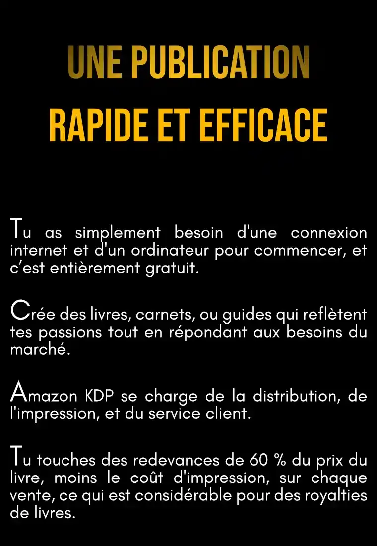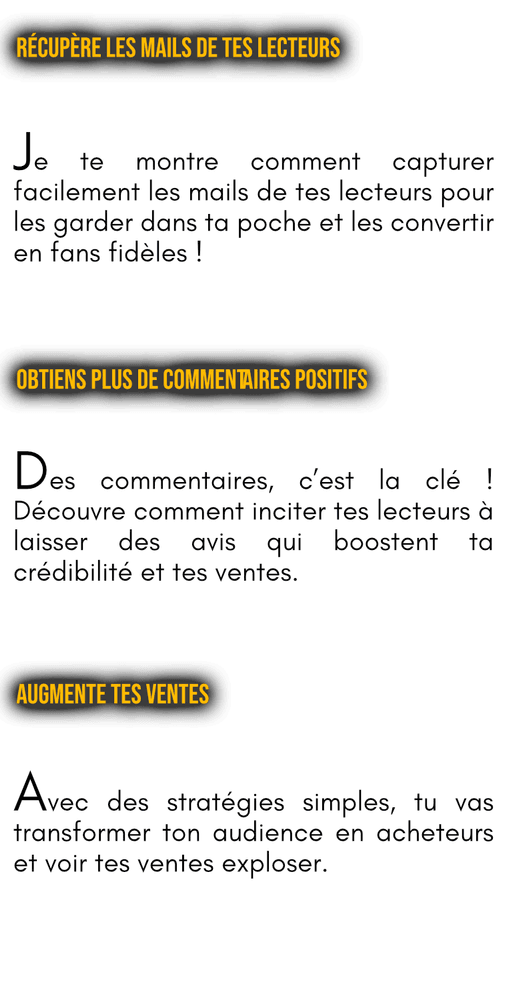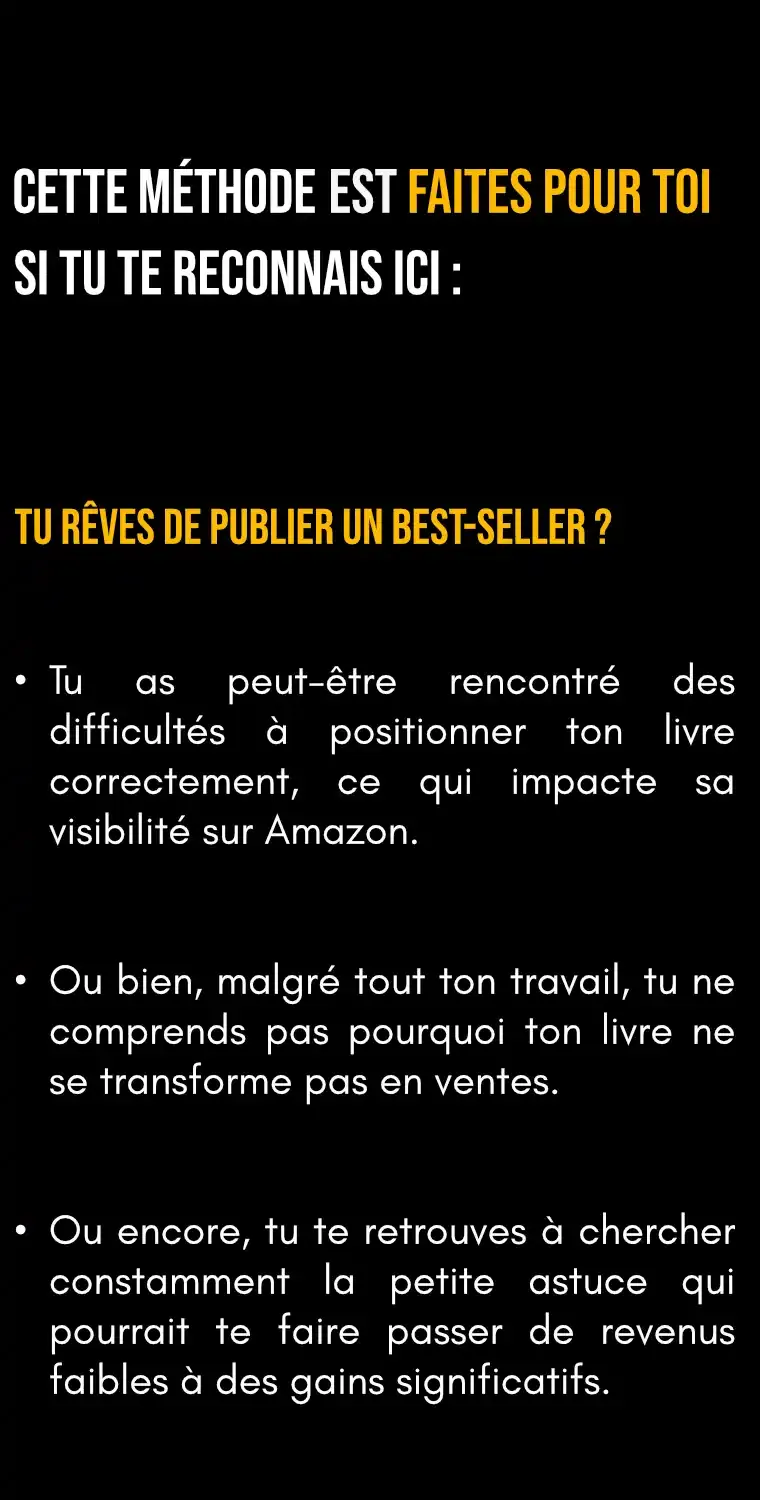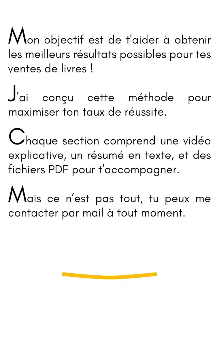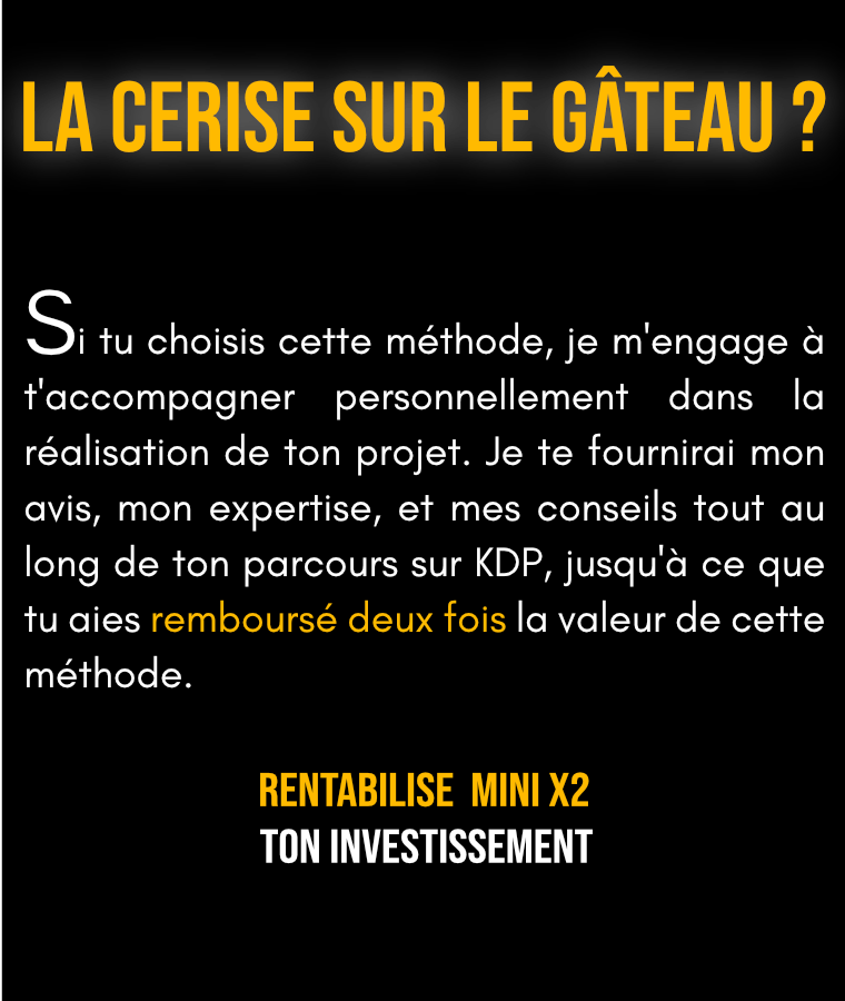 Oui, je garantis un résultat pour cette formation. Tant que tu n’as pas gagné au moins deux fois le prix de cette méthode en redevances KDP, je te soutiendrai à chaque étape jusqu’à ce que tu atteignes ton objectif.