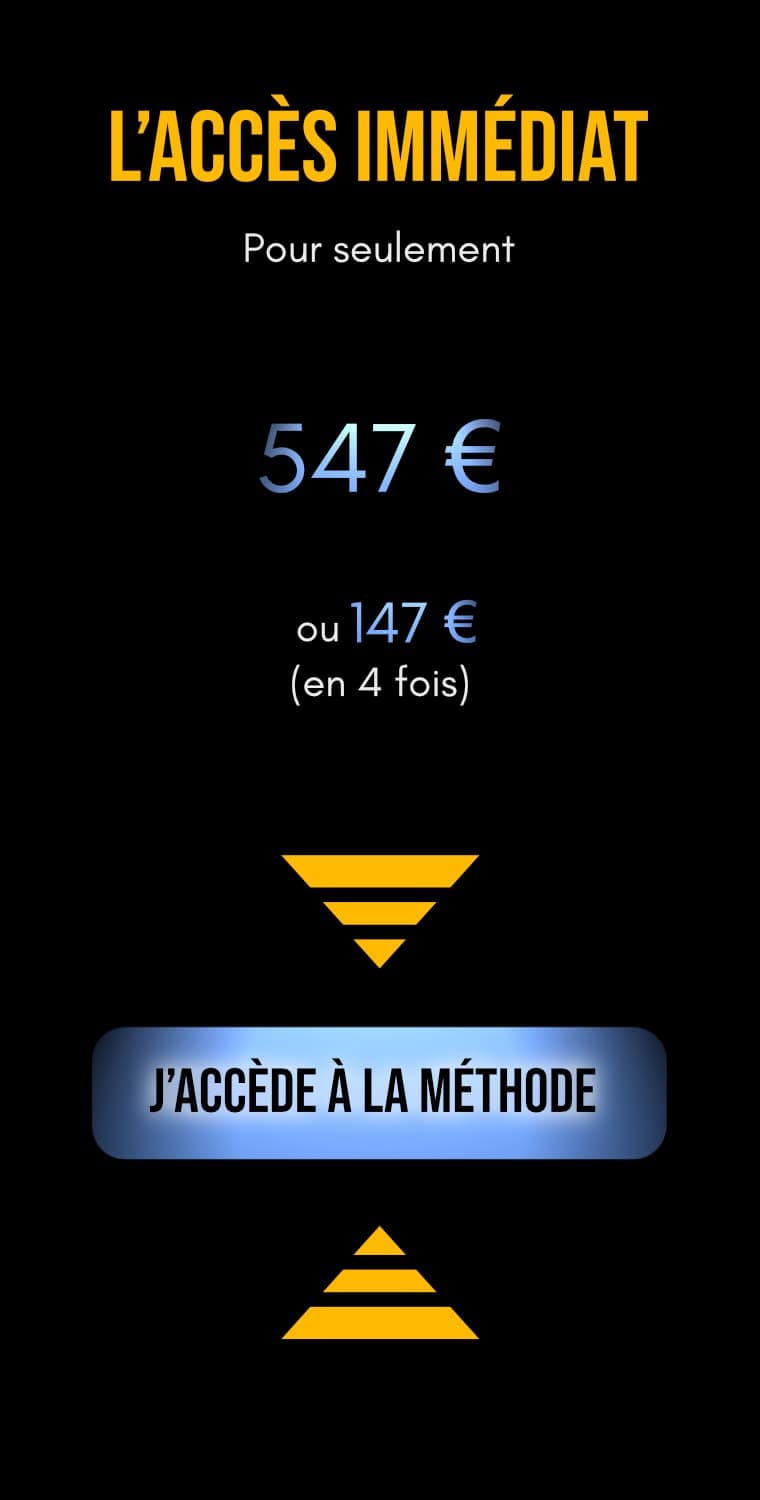 Tu obtiens accès au menu de la méthode immédiatement après l'achat (cours vidéo, PDF, communauté privée, groupe WhatsApp, etc.). Un email contenant le lien de connexion te sera envoyé pour cela.